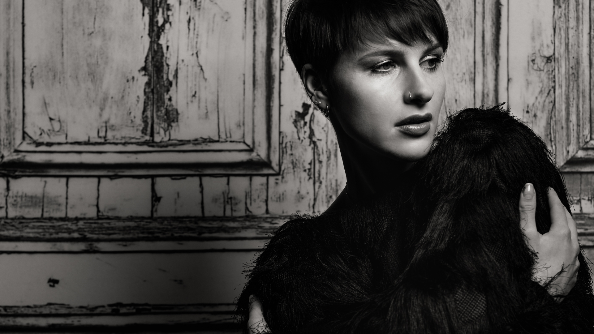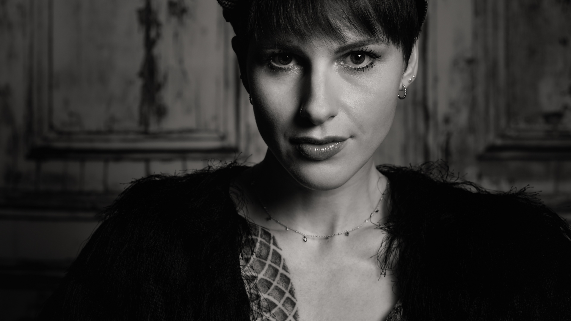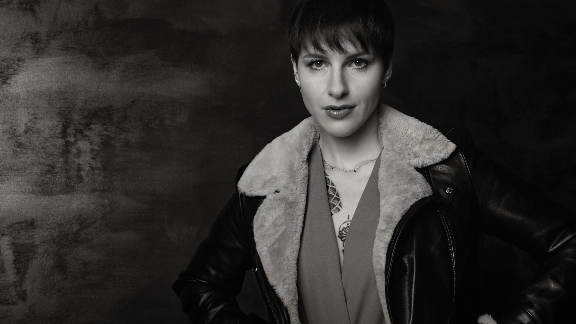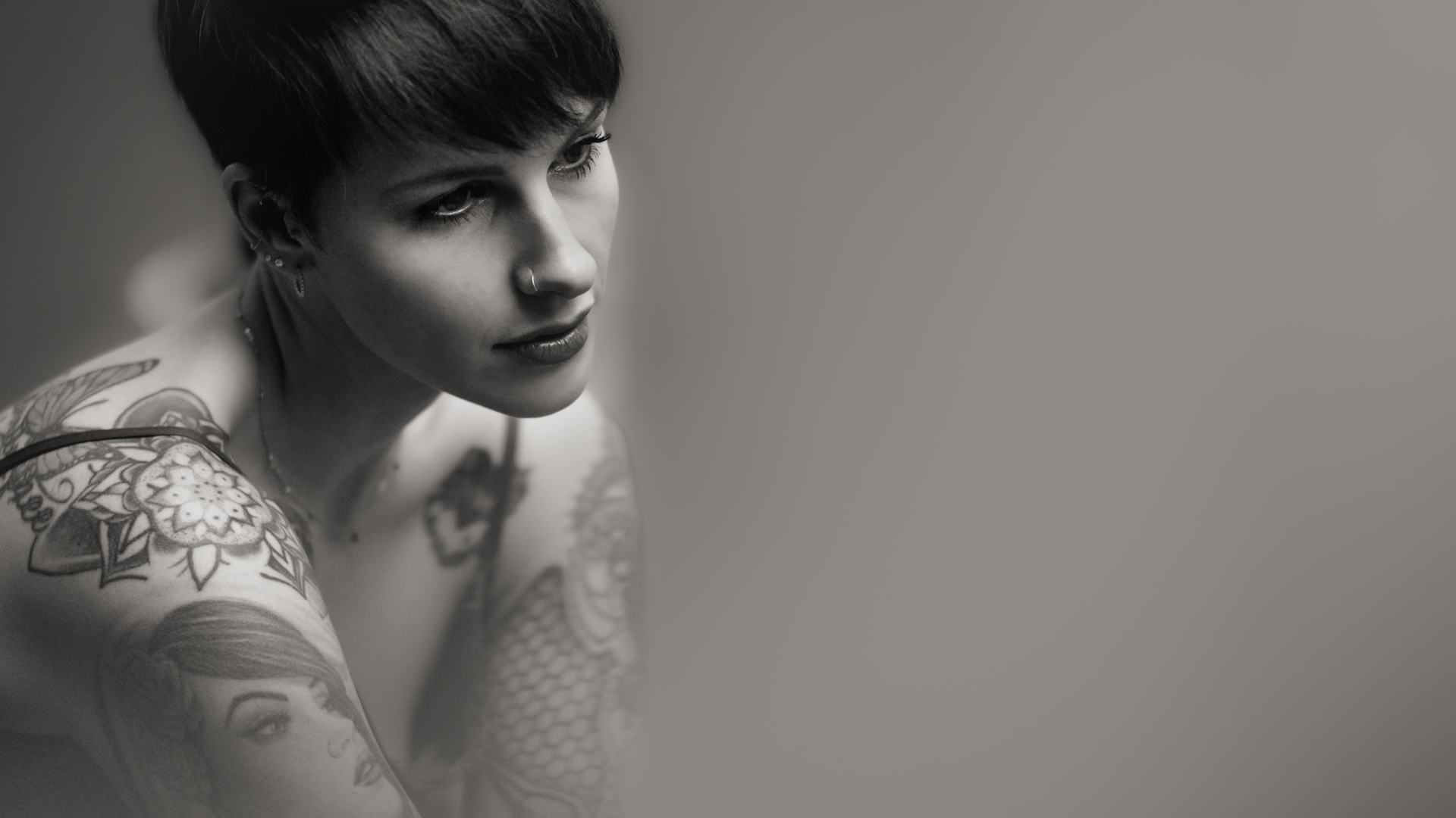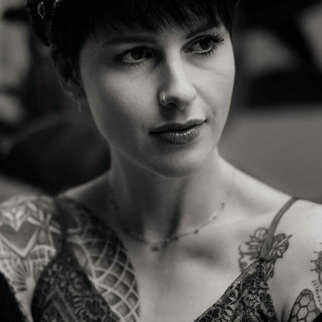 ¶ Fabienne ist mit ihren zahlreichen farbigen Tatoos ein Hingucker, sodaß alle in Farbe photographierten. – Dachte ich so bei mir, mach's mal anders und alles in Schwarz-Weiß, so kommen die vielen Facetten von Fabienne bestimmt gut rüber … Der Plan ging auf, denn Mimik und Blick von Fabienne sind das, was sofort auffällt.