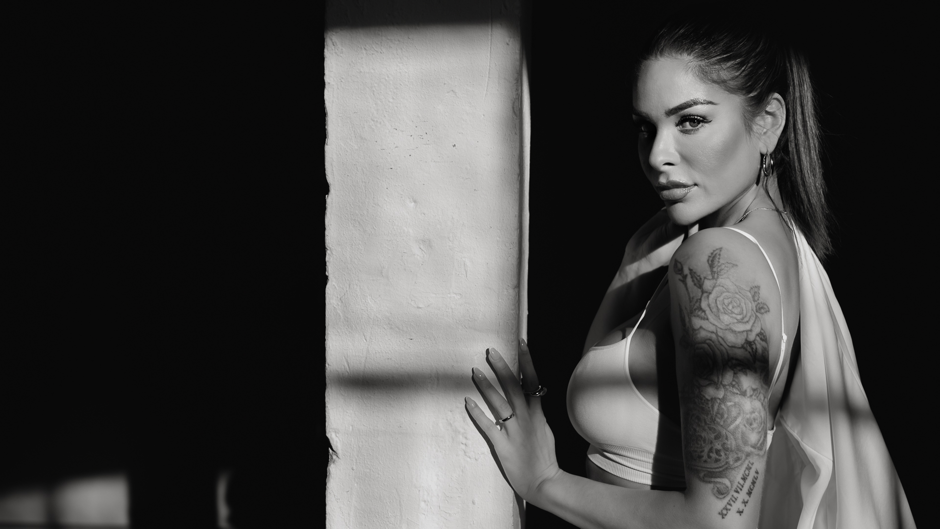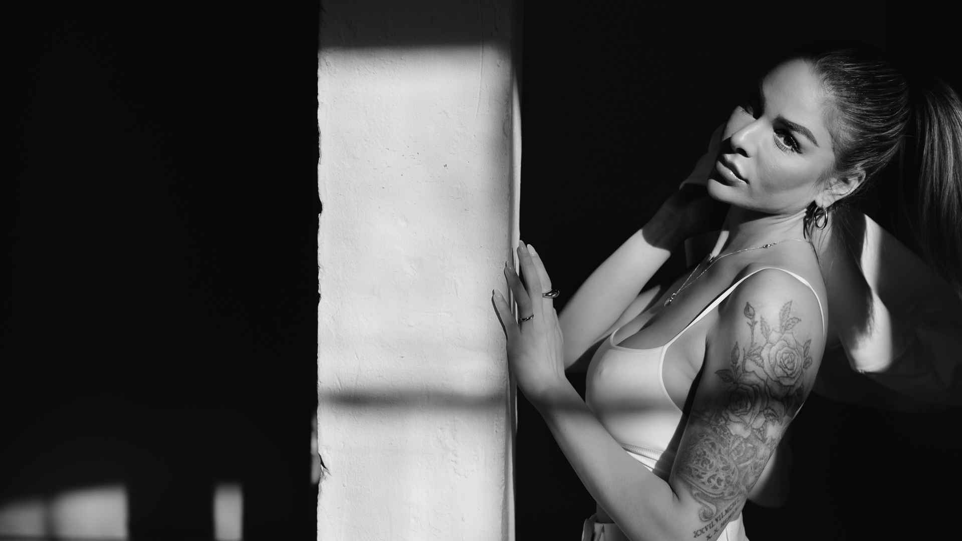 ¶ … in der zweiten Hälfte vom Shooting bei Ingo Müller konnten wir gut auf Blitzlicht verzichten: die späte Nachmittagssonne knallte durch das riesige Studiofenster und erzeugte ein interessantes Licht mit harten Kontrasten. – Also Nadine ins Licht gestellt und sehen was geht …