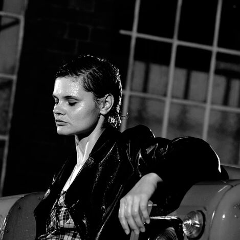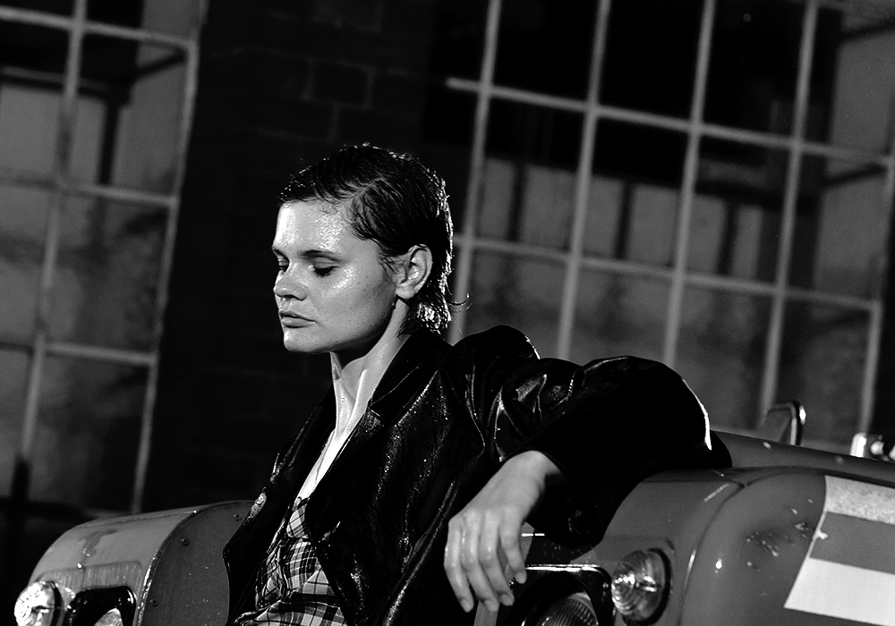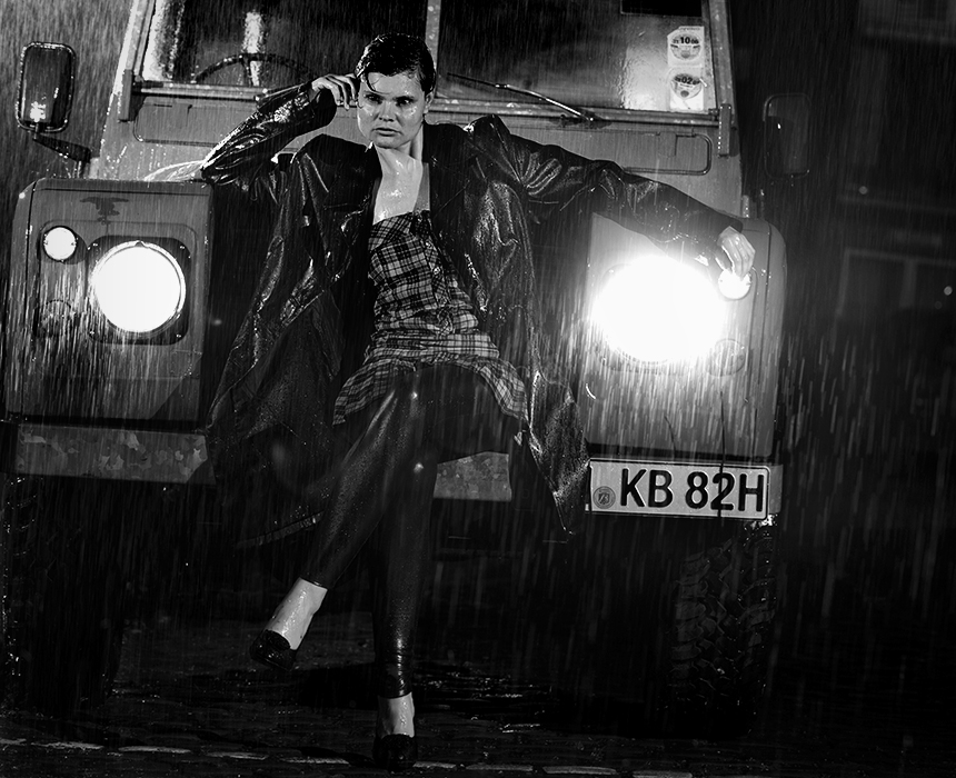 ¶ Thomas Stelzmann und Stephan Lode von gebaeude1 hatten sich mächtig ins Zeug gelegt. Ein irrwitziger Aufwand mit zwei 5000 Liter Wasser-Reservoirs halfen eine perfekte Regensshow zu erschaffen. Im Hof ein alter Original-Landy auf holprigem, rundem Kopfsteinpflaster; dazu »wasserfeste« Dauerlichtlampen zur Beleuchtung der Szenerie; je dunkler es wurde, desto mehr kam so eine Film Noir-Stimmung auf.