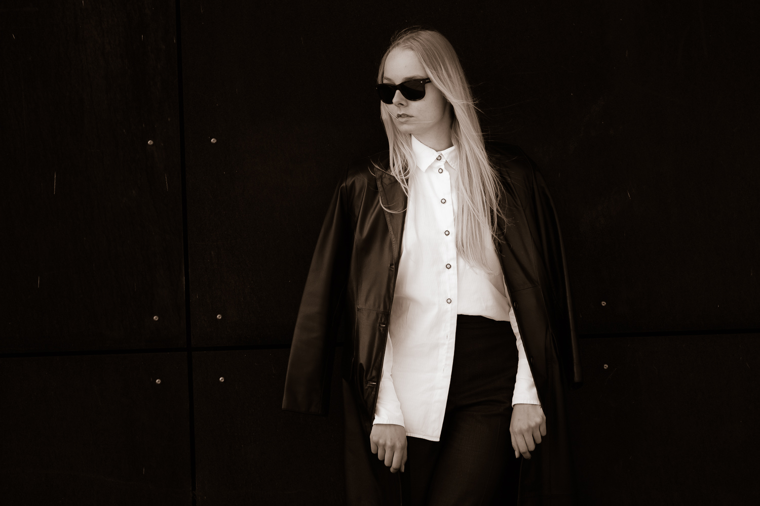 ¶ Das Shooting begann in der Nähe der Kranhäuser und der Wasserfontänen. Das Licht war bombig und der lange Mantel paßte super zum Ambiente. – Weiter ging es am Rheinufer entlang ( Darth Wader läßt grüßen