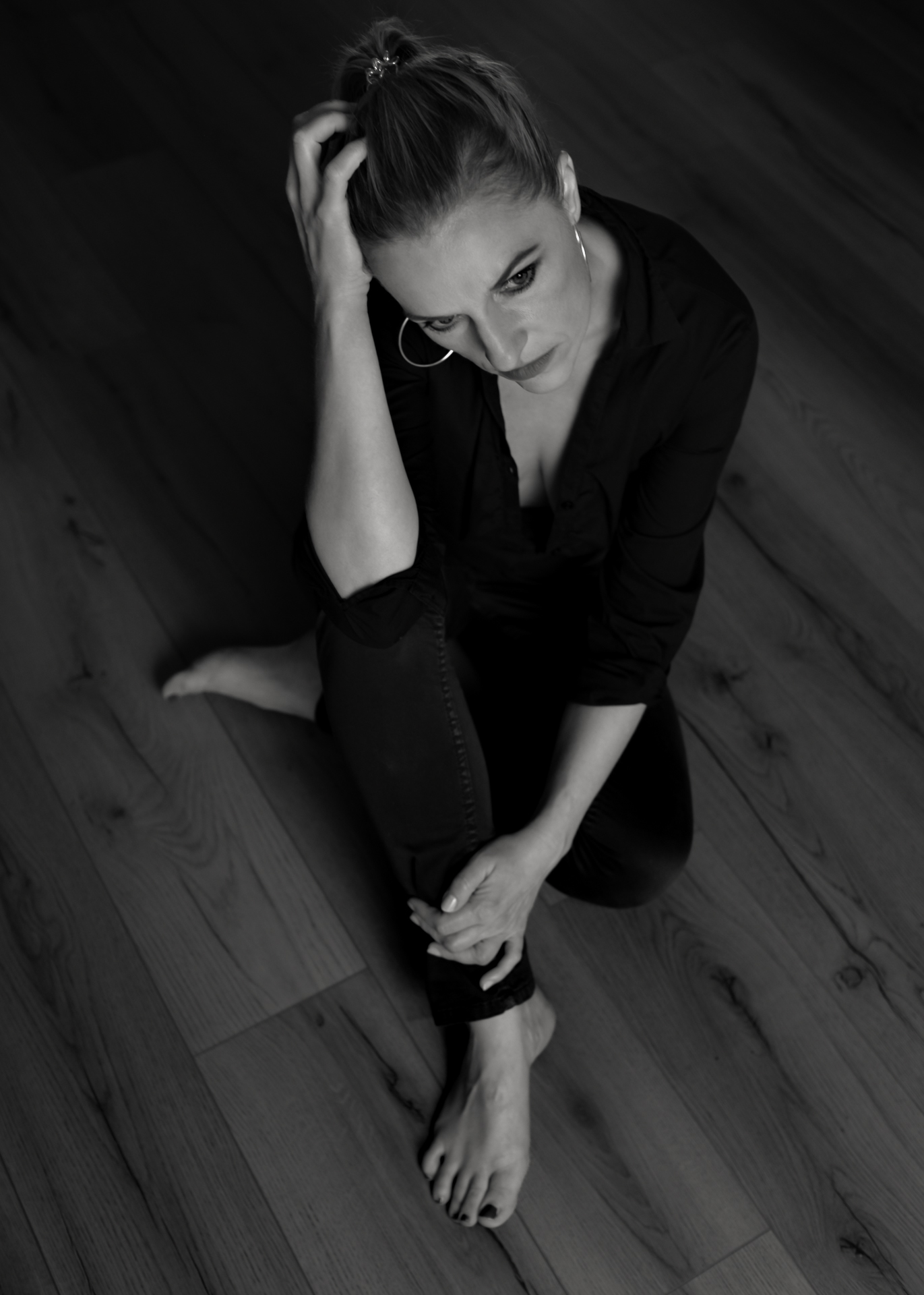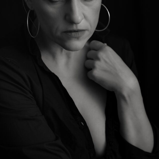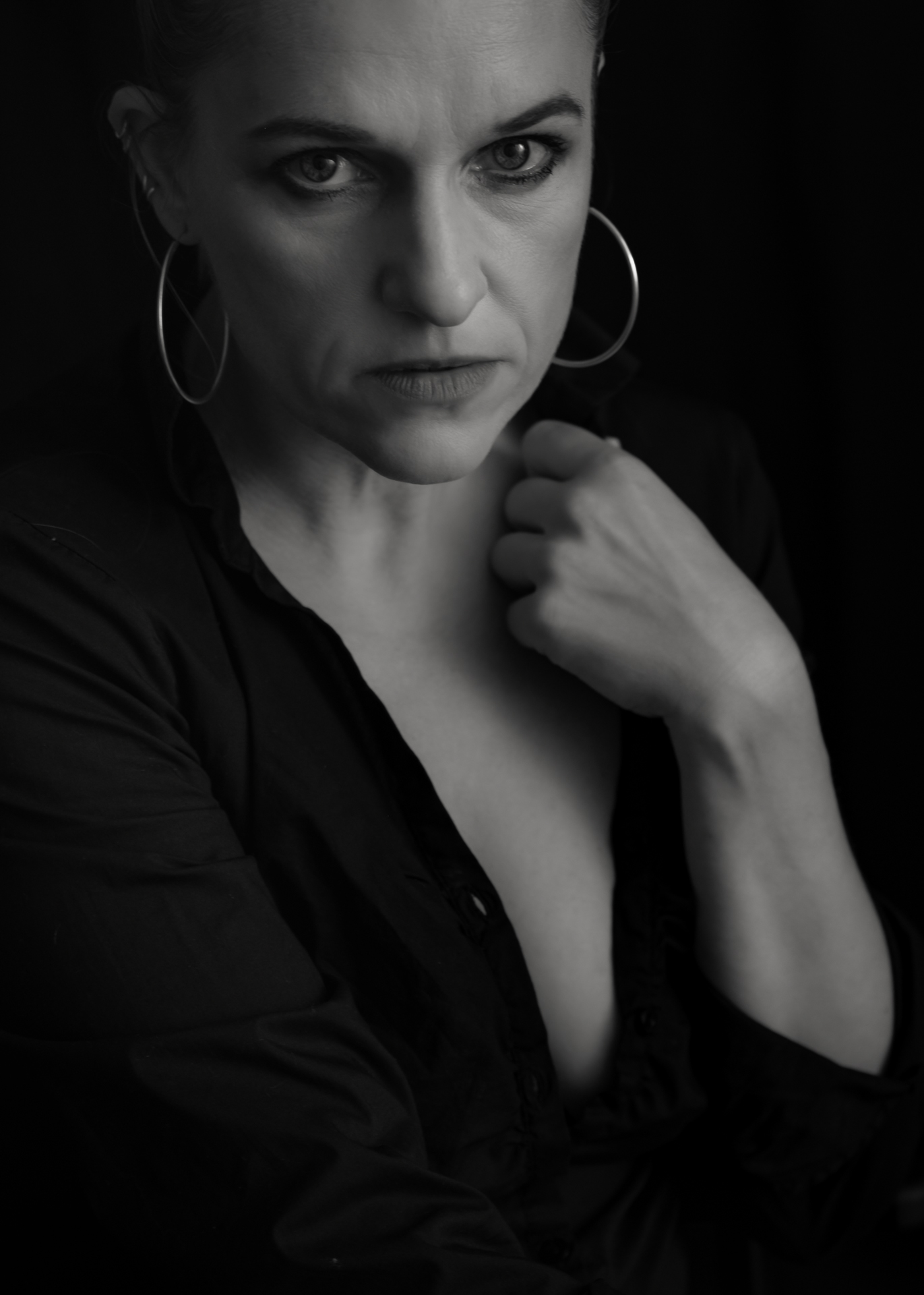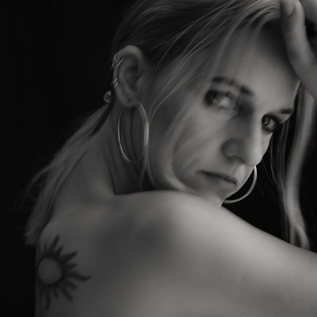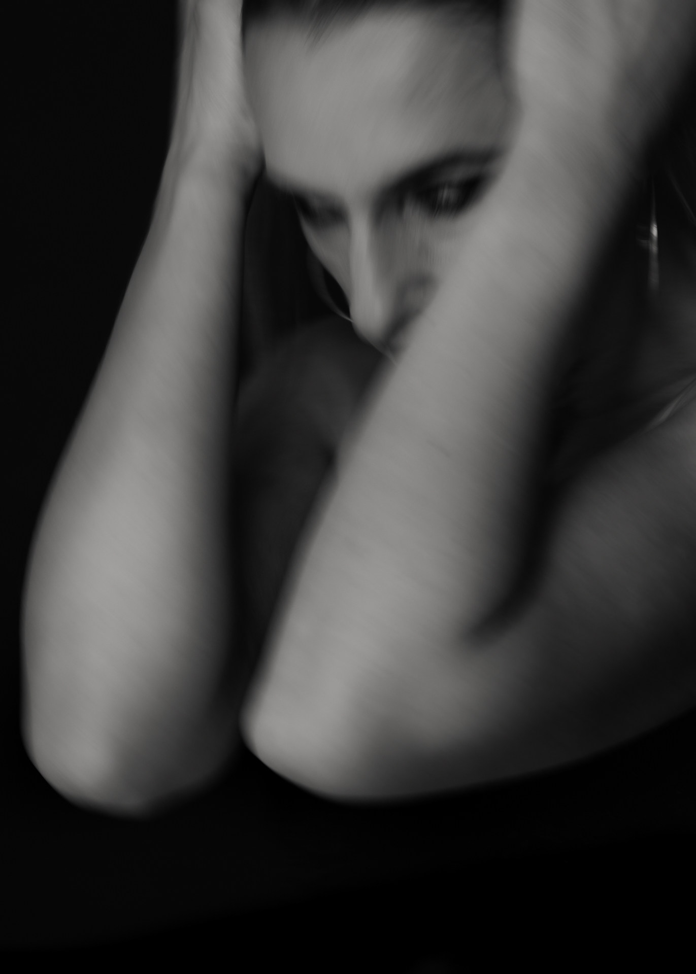 ¶ Es sind zwei sehr unterschiedliche, improvisierte Sets, die eins gemeinsam haben: ein Halogen-Dauerlicht. – Zwar ist es immer noch ein Kunstlicht und doch – je nach Einsatz – läßt sich damit so was wie Available-Light simulieren. Die geringe Lichtleistung führt automatisch zu längeren Belichtungszeiten, was beabsichtigt war, denn ich wollte Karo in ihren Bewegungen einfangen und keine statisch-perfekt geblitzte Studio-Bilder produzieren. Alles sollte einen imperfekten, fast analogen-Film-Look bekommen … Hat es denn auch!