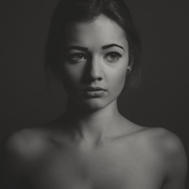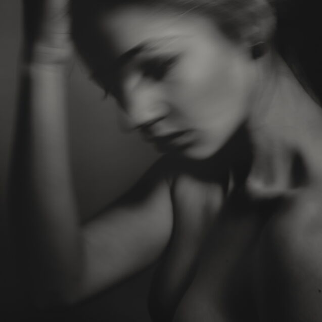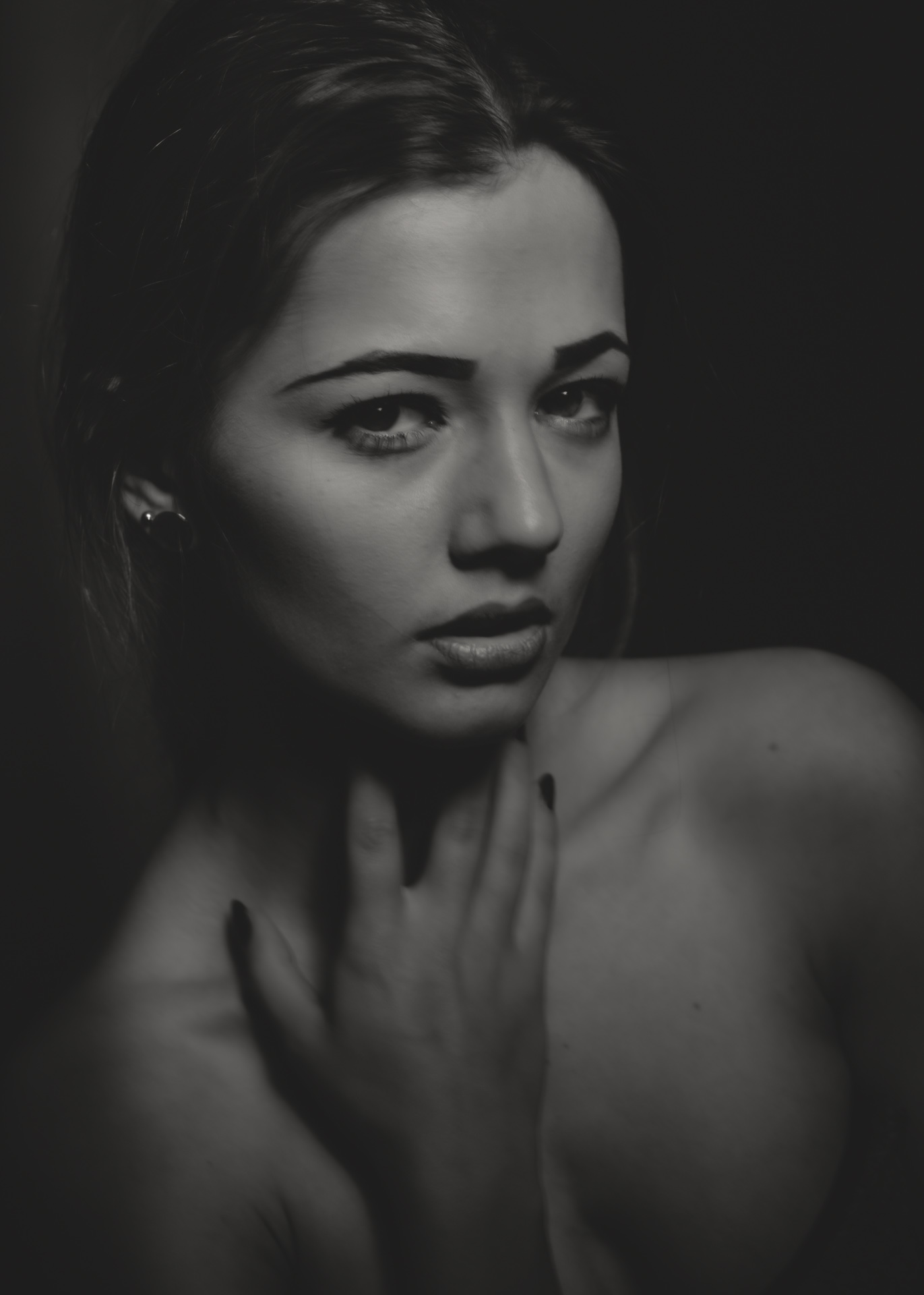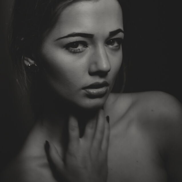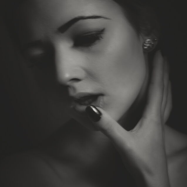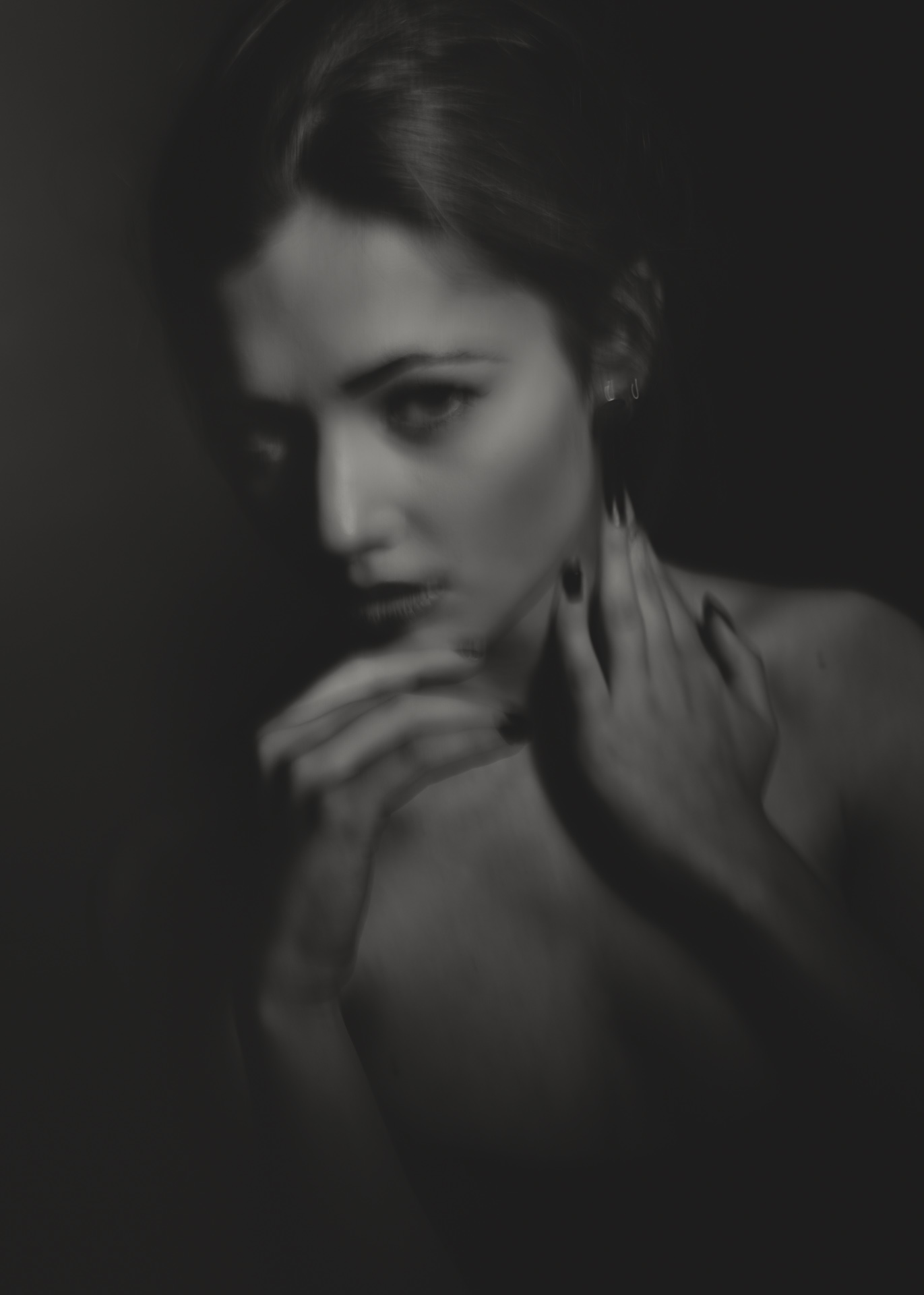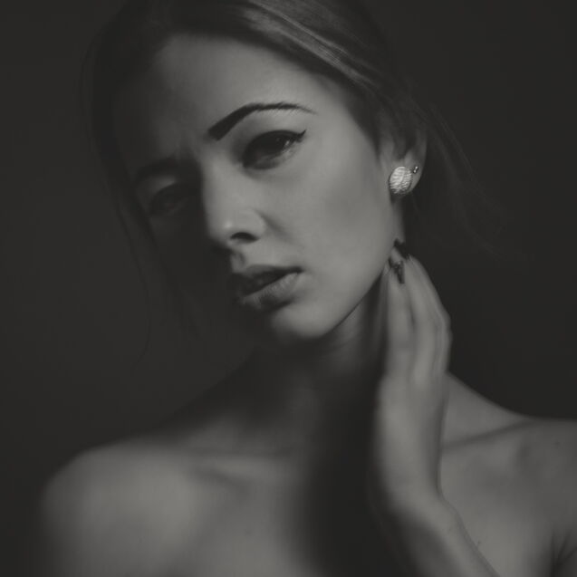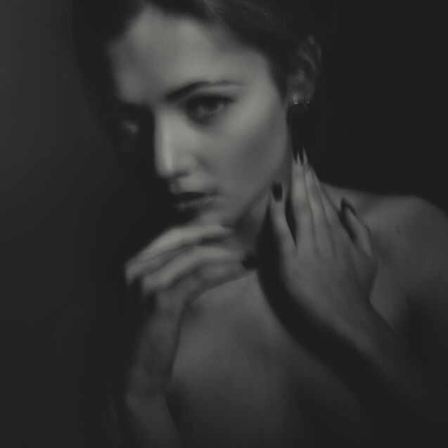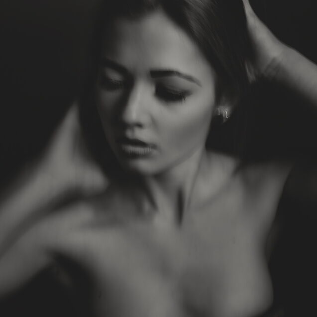 ¶ Mit nur einer Dauerlicht-Lampe und extrem langen Zeiten sind uns wirklich andere Bilder im kontrastarmen Schwarz-Weiß gelungen, bei denen Kathis Vorzüge in einem ganz anderen Licht erschienen. Sie hat unglaublich viel Potential und kann so ziemlich alles darstellen: elegant, beauty, fashion, sexy, grunge und auch vieles dazwischen, – wie hier zu sehen.