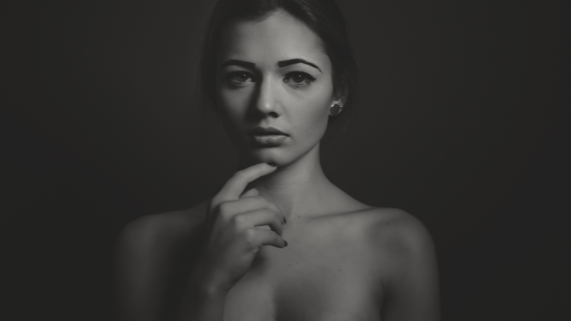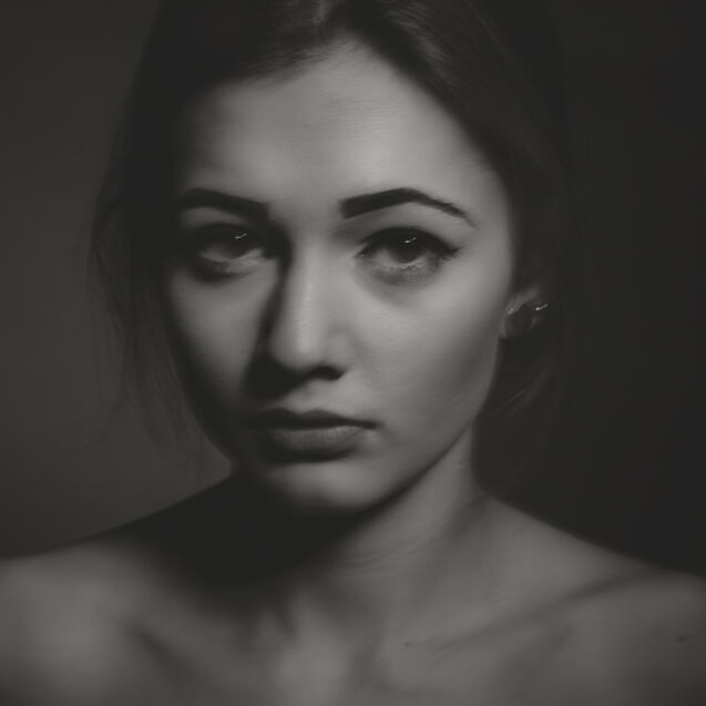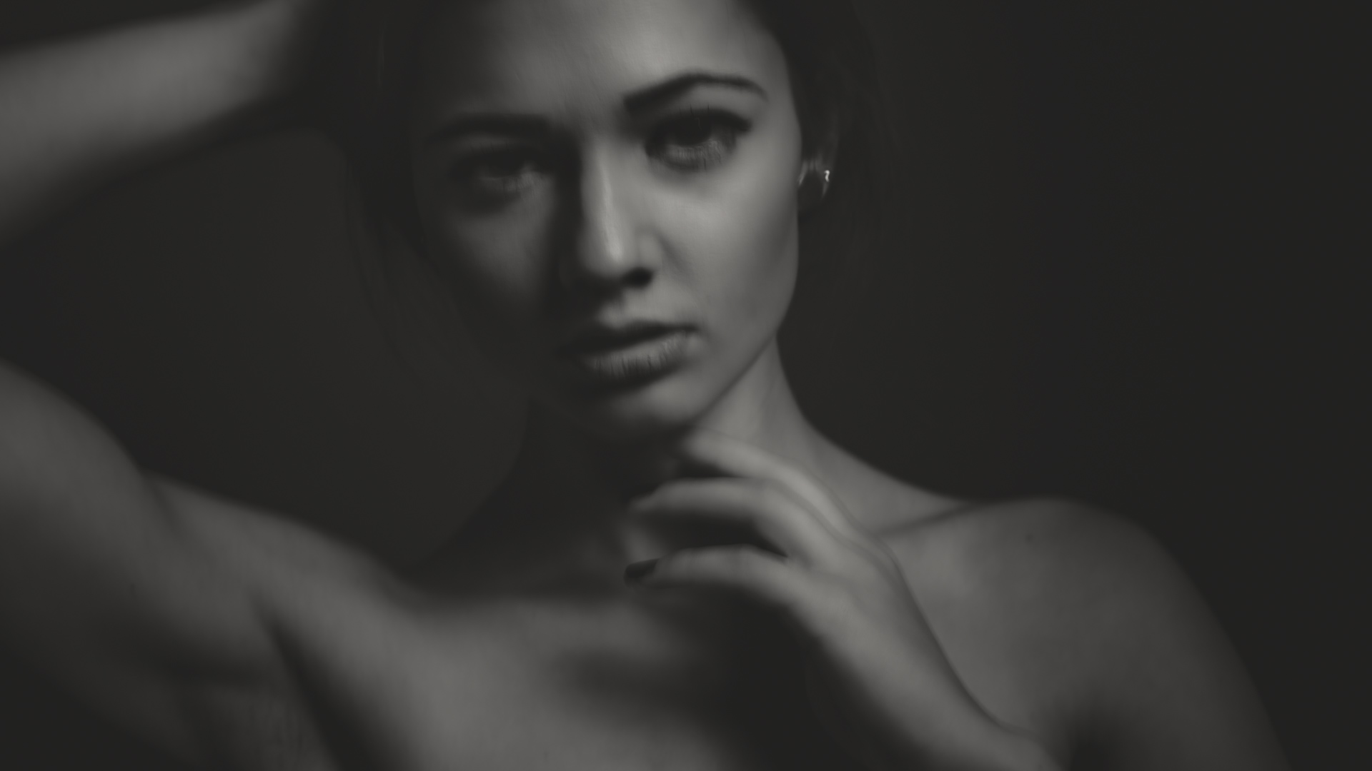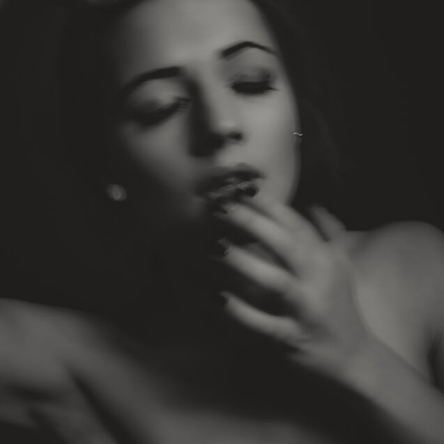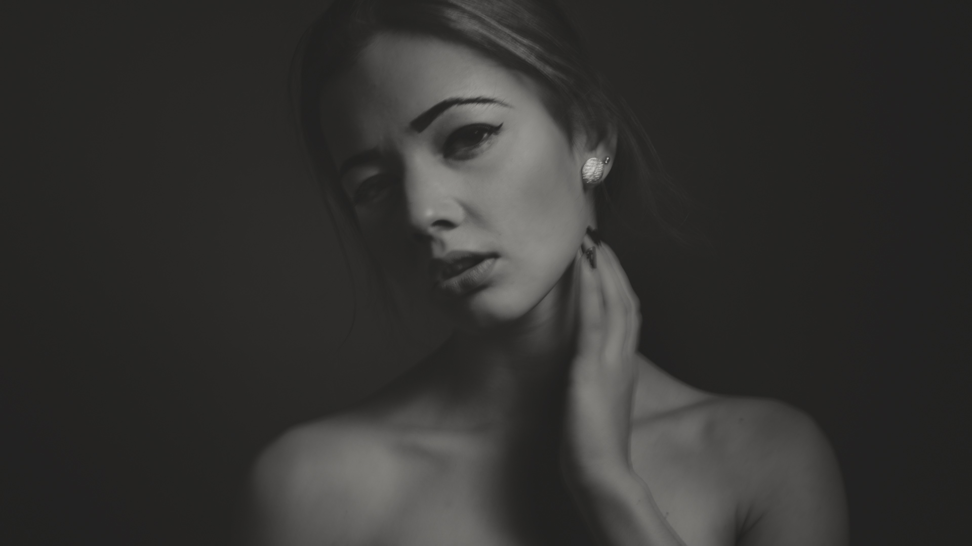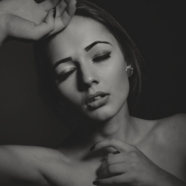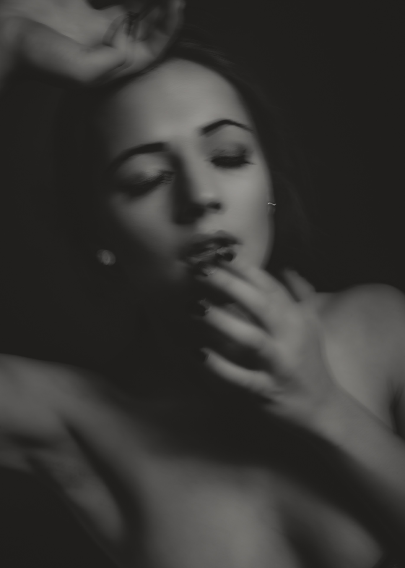 ¶ Mit nur einer Dauerlicht-Lampe und extrem langen Zeiten sind uns wirklich andere Bilder im kontrastarmen Schwarz-Weiß gelungen, bei denen Kathis Vorzüge in einem ganz anderen Licht erschienen. Sie hat unglaublich viel Potential und kann so ziemlich alles darstellen: elegant, beauty, fashion, sexy, grunge und auch vieles dazwischen, – wie hier zu sehen.