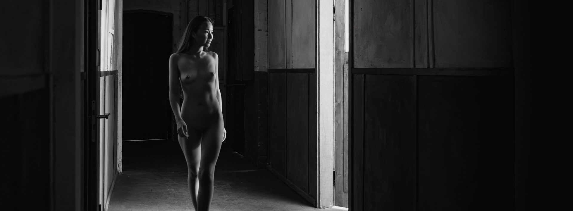¶ Reparieren war nicht, also alles neu machen! – Nun gut, einmal dabei, habe ich das Bildmaterial spaßeshalber in einem extremen Panoramaformat ausgegeben. Damit wird eine andere Bildwirkung erzeugt und verleiht den Bildmotiven einen anderen Look: der weit ausgedehnte Raum schafft eine neue Interpretation von »Akt im Raum«. – Mir gefällts. Und Euch? ![]()