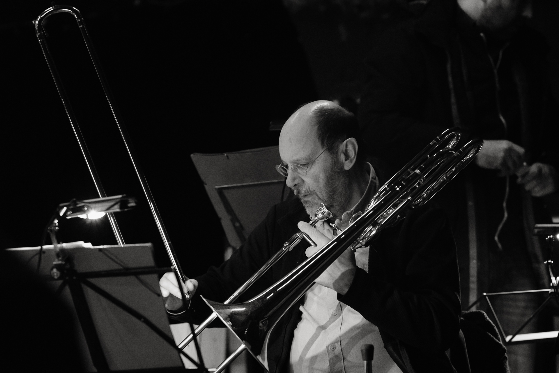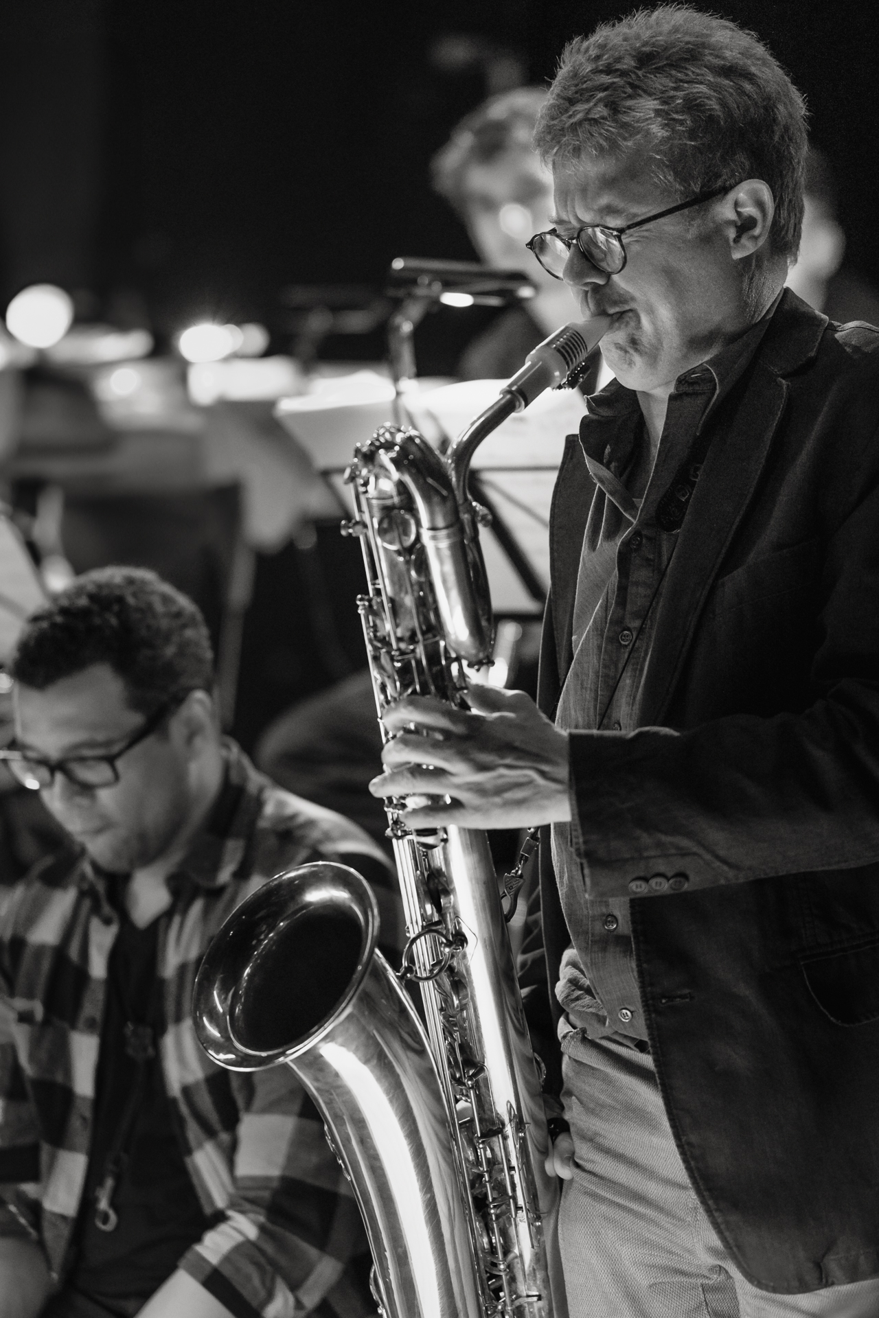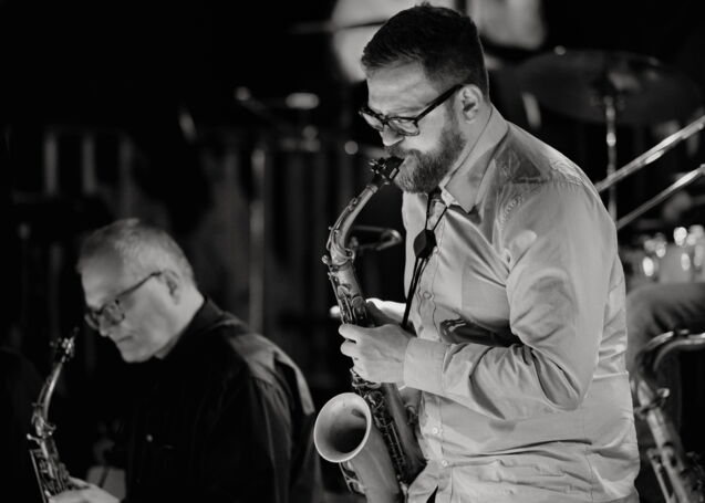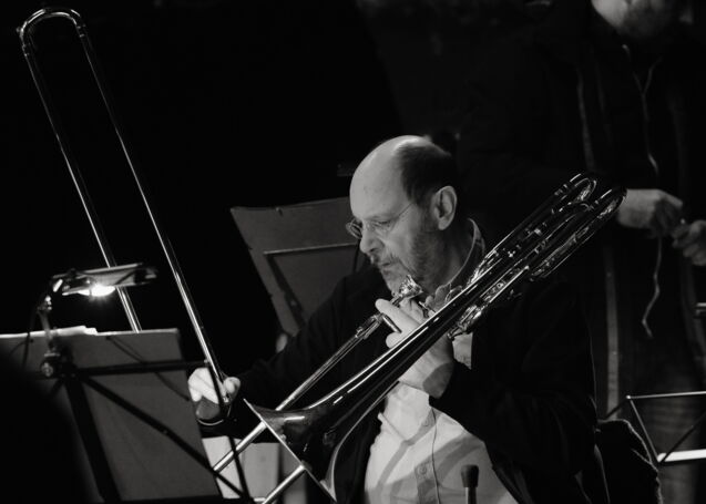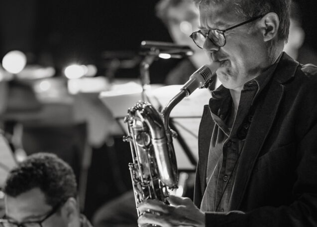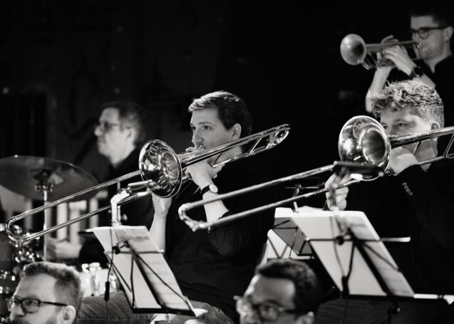 ¶ Die »Big Band Convention« hat eine lange Tradition, aber in den letzten Jahren gab es einige Auftrittspausen … Übrigens eine »richtige« BigBand: 4mal Trompete, 4mal Posaune und 5mal Saxophon. Und als Sahnehäubchen mit dabei ein Baritone-Sax, eine Bass-Posaune und Matthias Struck am Vibraphon. – Mehr Details von der Ankündigungsseite des Veranstalters …