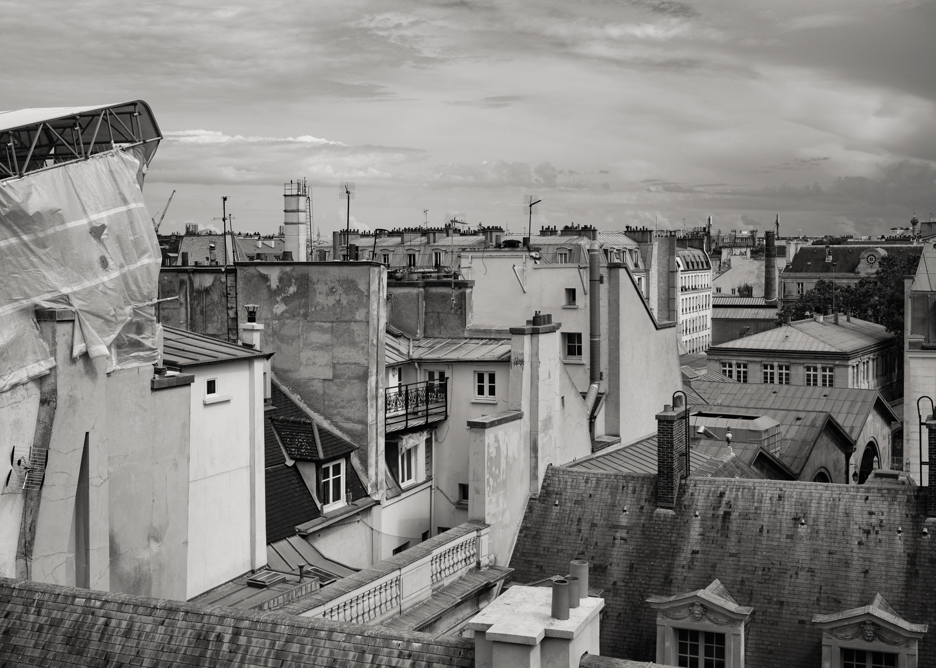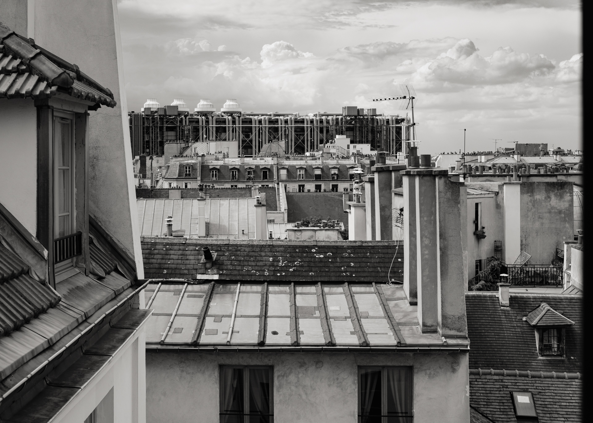 ¶ Viele Pariser Wohnungen haben ja so einen kleinen »Halb-Balkon« für maximal zwei(??) Personen, – so auch bei Peter … Leise tröpfelte der Regen auf den leeren Tisch und mein Blick wanderte so über die »Dächer von Paris«: jahrhundertealte gewachsene Architektur, chaotisch, wild zusammengewürfelt und im Hintergrund das moderne Centre Georges Pompidou … eine herrliche Szenerie!! 😊😂