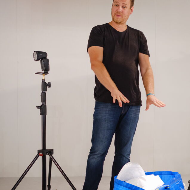 ¶ Mit sichtlich viel Humor präsentierte Bert ein-zwei kleine Blitze und eine Tasche voll „Krimskrams“ von … IKEA! Dies genügte ihm, um innerhalb weniger Minuten wunderschöne Portraitbilder zu zaubern. Wow! Gewußt wie! und zugleich eine Antwort auf alle jene, die meinen, nur mit gigantischen Aufwand gute Photos erstellen zu können. Ein überaus vergnüglicher Vortrag für alle technikbegeisterten Photographen