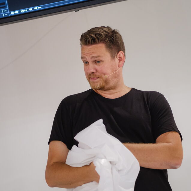¶ Patrick La Roque zeigte die Reduktion mehrer Licht-Setups auf das Wesentliche. Nicht mal ein Lichtformer war für ihn nötig, um mit einer geschickten Handhabung von nur einem Aufsteckblitz Bilder zu erzeugen, wie ich sie in dieser Form noch nirgendswo gesehen habe. Puh! Einfach genial! Und wer jetzt fragt, wo die Bilder vom Shooting sind, der kann sie auf seiner Webseite bestaunen …