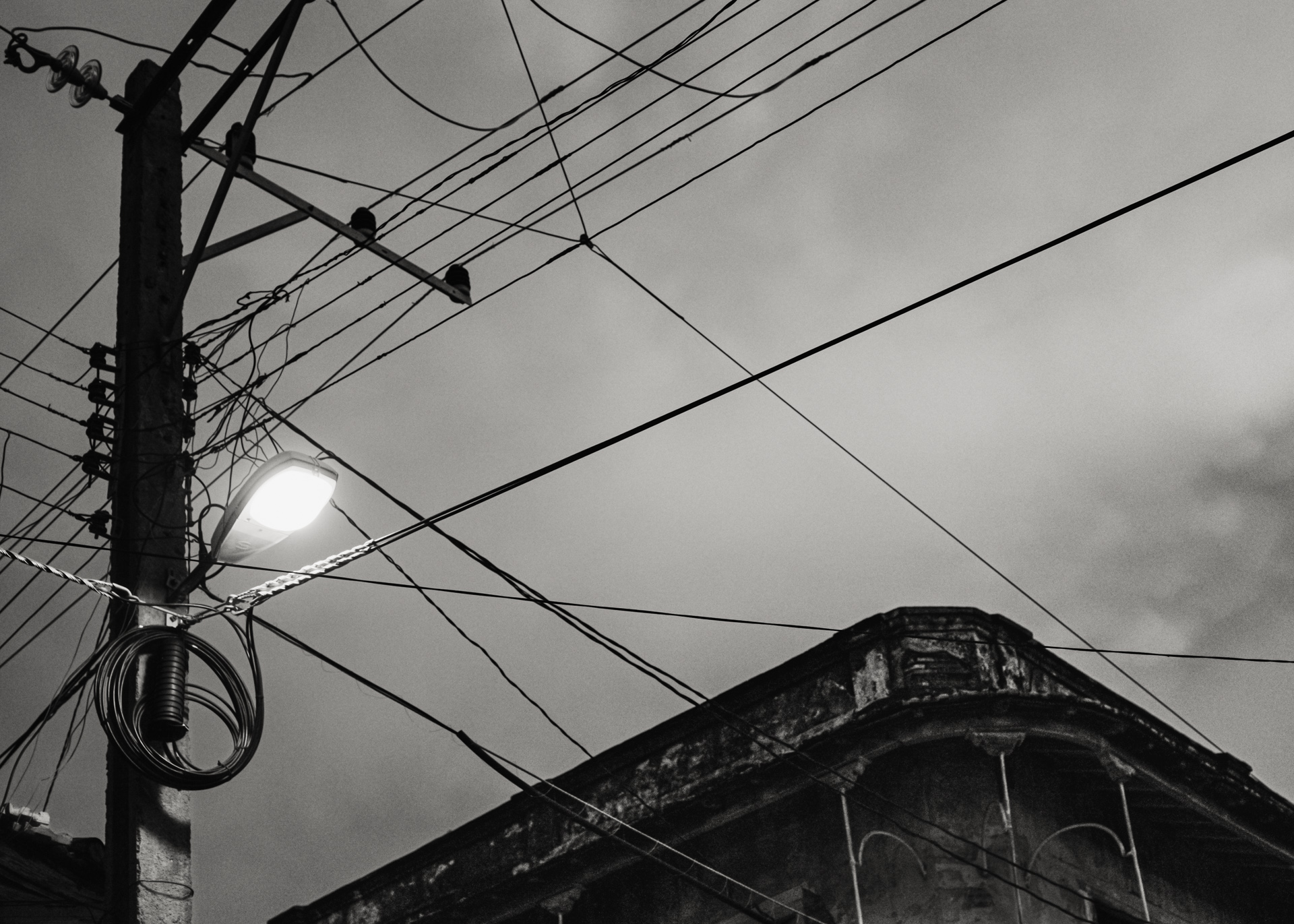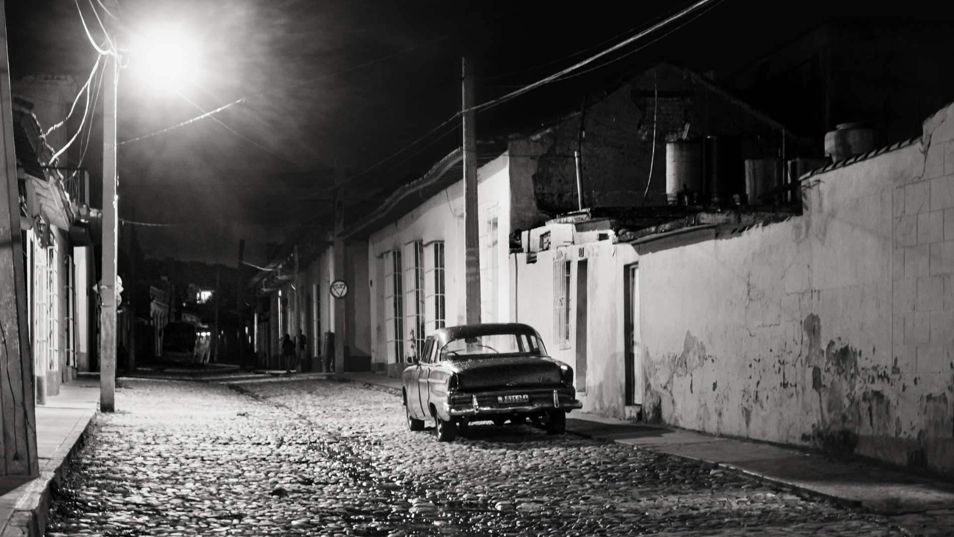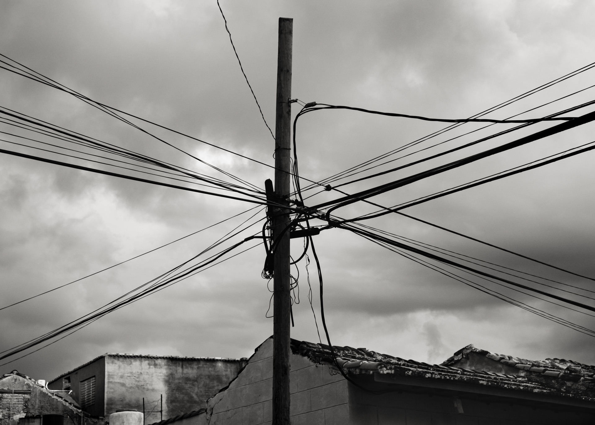 ¶ Sosehr die farbige Buntheit auf den ersten Blick beeindruckt, kann sie nicht darüber hinweg täuschen, daß es auch eine andere Seite des Lebens in Trinidad gibt, – dann, wenn die Lichter aus sind, die Sonne nicht mehr ganz so hell die bröckelnden Fassaden bescheint und sich eine gewisse Tristesse über die Szenerie legt. Diese Stimmung in Bildern festzuhalten, dazu eignet sich die Schwarz-Weiß Darstellung nun einmal besser.