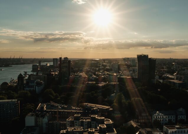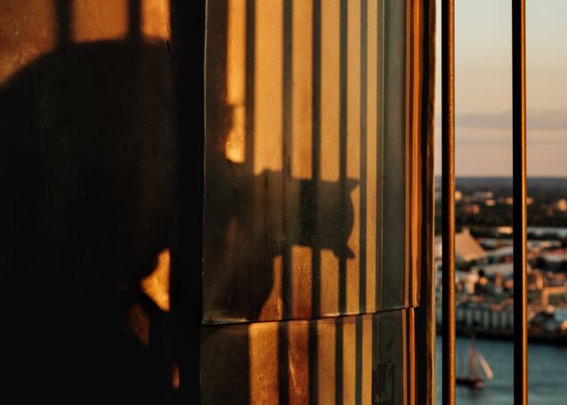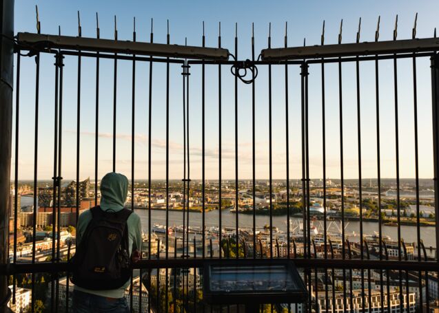 ¶ Ein weiteres Wahrzeichen Hamburgs ist sicherlich der Michel und Paddy hatte zum Ende des Tages einen Besuch auf dem Turm geplant. Wir hatten in mehrfacher Hinsicht Glück: es war spätsommerlich warm, kaum Wind und bei klarem Himmel eine tolle Weitsicht in alle Richtungen. Und dann als Sahnehäubchen noch ein Sonnenuntergang aus dem Bilderbuch. Mega und ein cooler Abschluß des Tages!