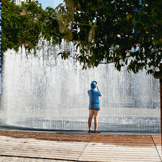 ¶ Im Gegensatz zu damals war das Gelände sehr belebt. Vielleicht lag das an dem herrlichen, überaus heißen Sommerwetter. Viele Familien bevölkerten mit ihren Kindern das Gelände und die Fontänen des Wasserspiels bot ihnen denn auch eine willkommene Abkühlung, – die Kids hatten jedenfalls einen Riesenspaß …